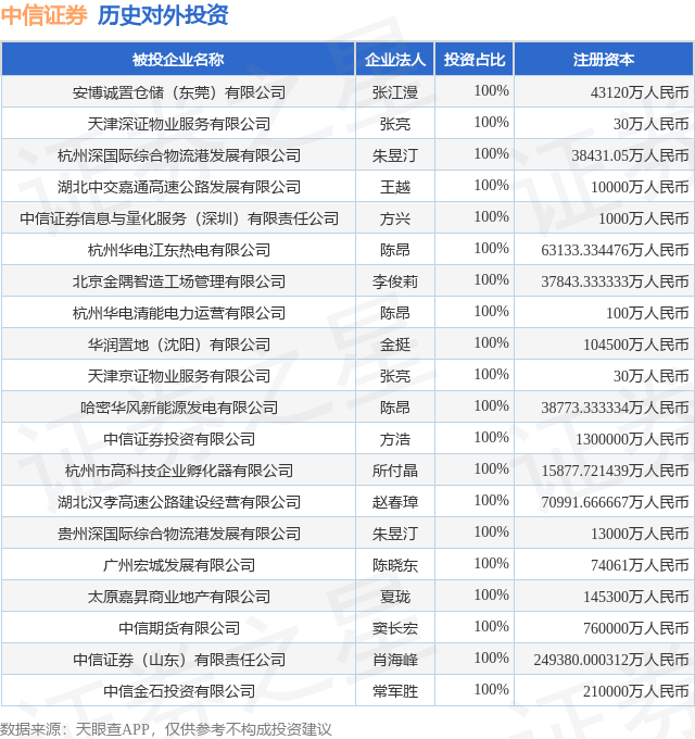 证券之星音讯,依据天眼查APP拂尘,中信证券(600030.SH)新增一同对外出资事情,被出资公司为安博诚置仓储(东莞)有限公司,法定代表人张江漫,出资占比为100%。该公司从事装卸转移和仓储业,注册资本为43120万人民币。现在,中信证券共存在对外出资311项,出资占比前20的项目见下表: